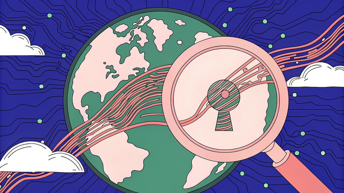 A magnifying glass examining a webpage's content and structure, with a search engine robot nearby, symbolizing on-page SEO.